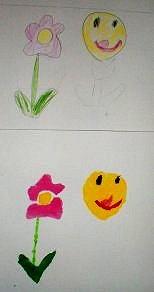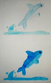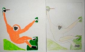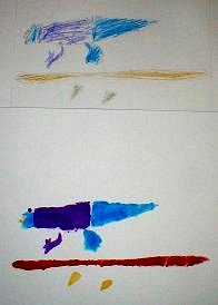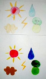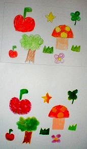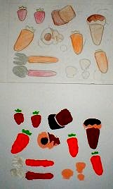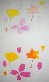 7色の濃さ、重なりを考えて印刷の順番を決め、見当印に合わせて印刷する 今回は水彩絵具をつかいタンポでしました。